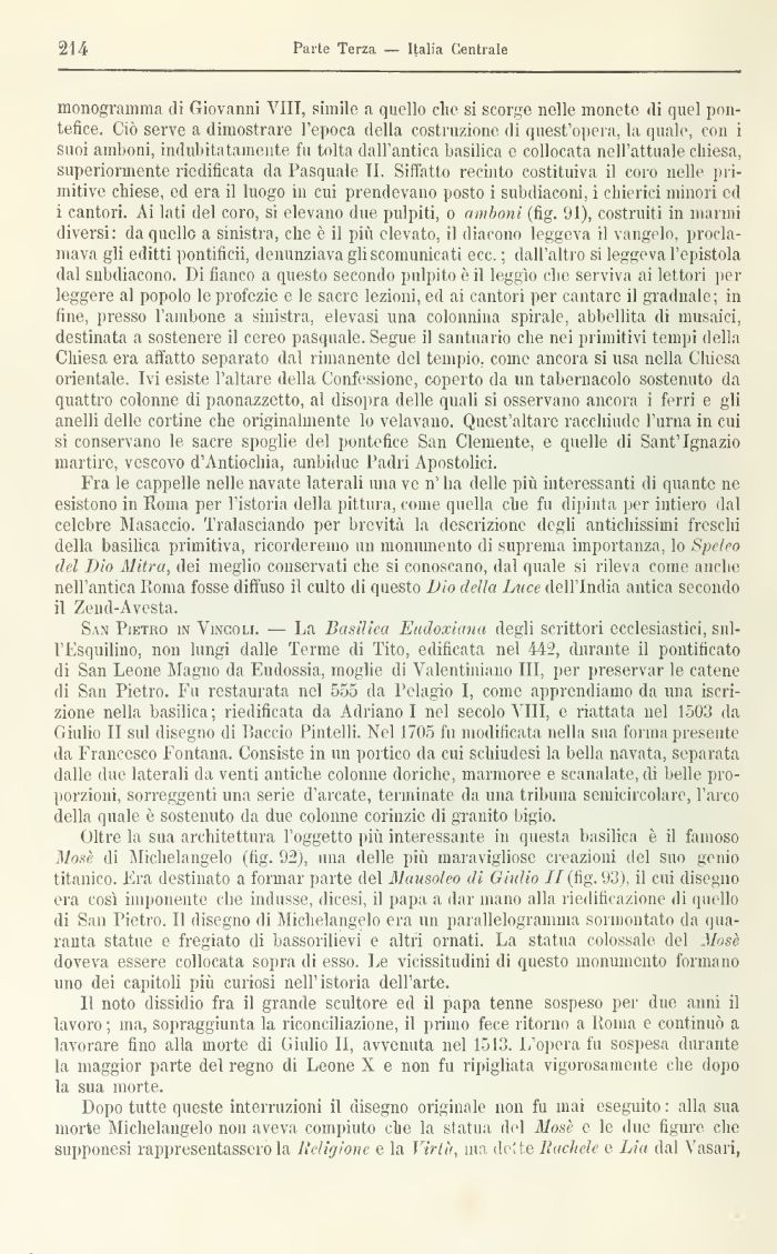Oltre la sua architettura l'oggetto più interessante in questa basilica è il famoso Mose di Michelangelo (fig. 92), una delle più niaravigliose creazioni del suo genio titanico. Fra destinato a formar parte del Mausoleo di Giulio li (fig. 93), il cui disegno era così imponente che indusse, dicesi, il papa a dar mano alla riedificazione di quello di San Pietro. Il disegno di Michelangelo era un parallelogramma sormontato da qua-rauta statue e fregiato di bassorilievi e altri ornati. La statua colossale del Mose doveva essere collocata sopra di esso. Le vicissitudini di questo monumento formano uno dei capitoli più curiosi nell'istoria dell'arte.