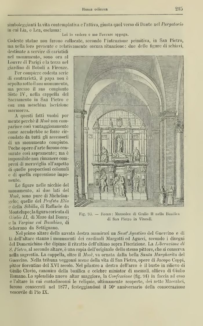 Le figure nelle niccliie del monumento, ai due lati del l//).se;, sono pure di Michelangelo; quelle del Profeta Elia e della Sibilla, di Raffaele da \[ontelupo;la figura coricata (li Fjg_ lj;, _ Rom. Mauso[eo GmIio „ nd]a Giulio II, di Staso dal Bosco; di San Fletro in Vincol;_