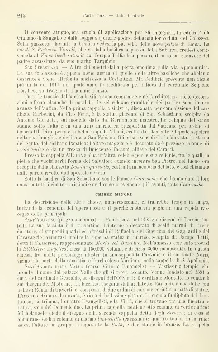 San Sebastiano. — A tre chilometri dalla porta omonima, sulla via Appia antica.. La sua fondazione è appena meno antica di quelle delle altre basìliche che abbiamo descritte e viene attribuita anch'ossa a Costantino. Ma l'editìzio presente non risale più in là del 1611, nel quale anno fu riedificata per intiero dal cardinale Scipione Borghese su disegno di ITaniiriio Ponzio.