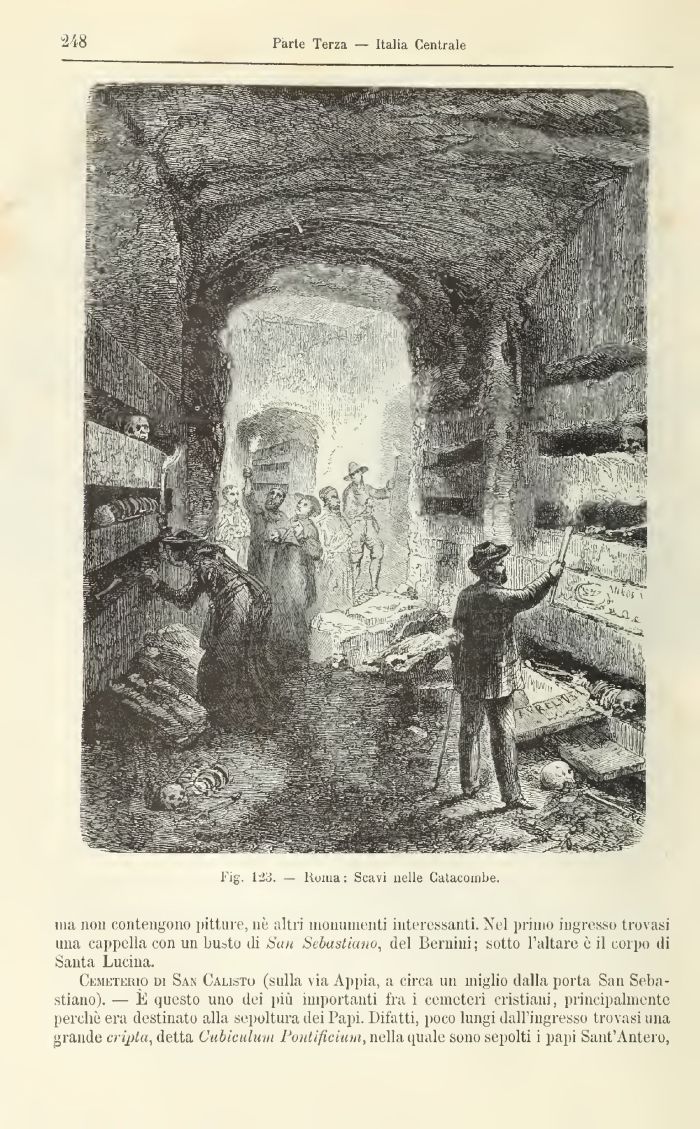 Cemeterio di San Calisto (sulla via Appia, a circa un miglio dalla porta San Sebastiano). — È questo uno dei più importanti fra i cemeteri cristiani, principalmente perchè era destinato alla sepoltura dei Papi. Difatti, poco lungi dall'ingresso trovasi una grande cripta, detta Cubiculum Poutificium, nella quale sono sepolti i papi Sant'Antere,