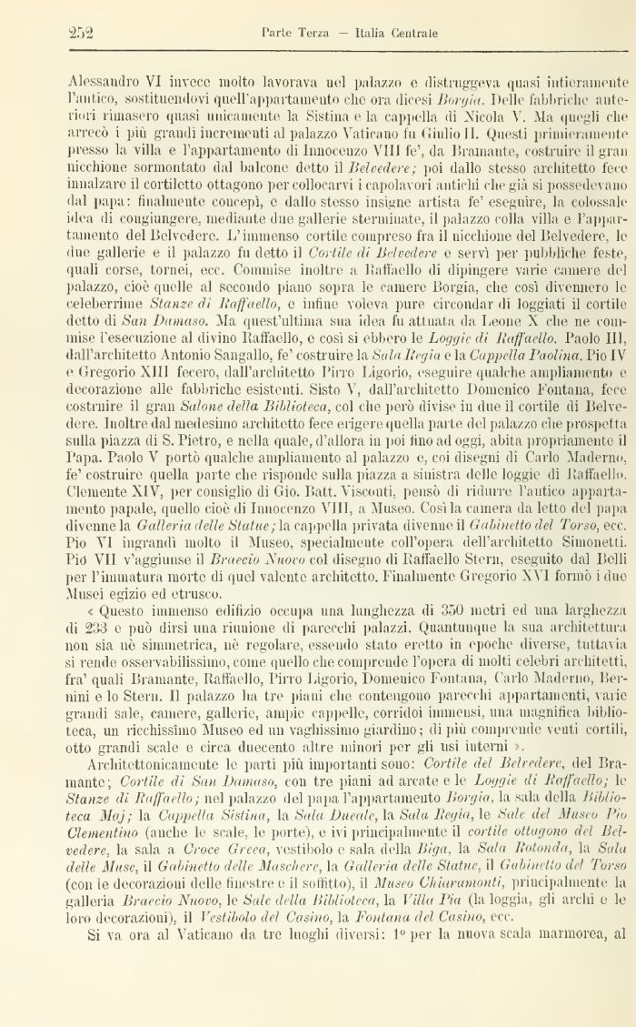 Alessandro VI invece molto lavorava nel palazzo e distruggeva quasi intieramente l'antico, sostituendovi quell'appartamento che ora dicesi Borgia. Delle fabbriche anteriori nniasero quasi unicamente la Sistina e la cappella di Nicola \. Ma quegli che arrecò i più granili incrementi al palazzo Vaticano fu Giulio II. Questi primieramente presso la villa e l'appartamento di Innocenzo Vili fe', da Bramante, costruire il gran nicchione sormontato dal balcone detto il Belvedere; poi dallo stesso architetto fece innalzare il cortiletto ottagono per collocami icapolavori antichi (die già si possedevano dal papa: finalmente concepì, e dallo stesso insigne artista fe' eseguire, la colossale alea di cougiungere, mediante due gallerie sterminate, il palazzo colla villa e l'appartamento del Belvedere. L'immenso cortile compreso fra il nicchione del Belvedere, le due gallerie e il palazzo fu detto il Cortile di Belvedere e servì per pubbliche feste, quali corse, tornei, ecc. Commise inoltre a Jlaffaello di dipingere varie camere del palazzo, cioè quelle al secondo piano sopra le camere Borgia, che così divennero le celeberrime Stanze di Raffaello, e infine voleva pure circondar di loggiati il cortile detto di San Damano. Ma quest'ultima sua idea fu attuata da Leone \ che ne coni mise l'esecuzione al divino Eaffaello, e così si ebbero le Loggie di Raffaello. Paolo III. dall'architetto Antonio Sangallo, fe' costruire la Sala Regia e la Cappella Paolina. Pio IV e Gregorio XIII fecero, dall'architetto l'ino Ligorio, eseguire qualche ampliamento e decorazione alle fabbriche esistenti. Sisto V, dall'architetto Domenico Fontana, fece costruire il gran Salone della Biblioteca, col che però divise iu due il cortile di Belvedere. Inoltre dal medesimo architetto fece erigere quella parte del palazzo che prospetta sulla piazza di S. Pietro, e nella quale, d'allora 111 poi tino ad oggi, abita propriamente il Papa. Paolo V portò qualche ampliamento al palazzo e, coi disegni di Carlo Mademo, fe' costruire quella parte che risponde sulla piazza a sinistra delle loggie di Baila elio. Clemente XIV, per consiglio di Gio. Batt. Visconti, pensò di ridurre l'antico appartamento papale, quello cioè di Innocenzo Vili, a Museo. Cosila camera da letto del papa divenne la Galleria delle Statue;\i\(&\)\)oWi\ privata divenne il Gabinetto del Torso, ecc. Pio VI ingrandì molto il Museo, specialmente coll'opera dell'architetto Simonetti. Pio VII v'aggiunse il Braccio Nuovi, col disegno di Raffaello Stern, eseguito dal Belli per l'immatura morte di quel valente architetto. Finalmente Gregorio N \ I formò i due Musei egizio ed etrusco.
