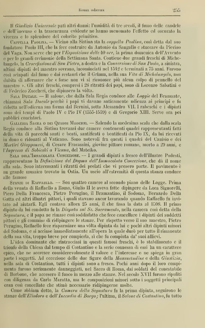 Stanze di Raffaello. — Son quattro camere al secondo piano delle Logge. Prima della venuta di Raffaello a Roma, Giulio II le aveva fatte dipingere da Luca Signorelli, Piero Della Francesca, Pietro Perugino, il Braniantino, il Sodoma, Bernardo Della Gatta ed altri illustri pittori, i quali stavano ancor lavorando quando Raffaello fu invitato ad aiutarli. Egli contava allora 25 anni, il che fissa la data al 1C08. Il primo dipinto da lui condotto fu la Disputa sul Ss. Sacramento, nella camera così detta della Segnatura, e il papa ne rimase così soddisfatto che fece cancellare i dipinti dei suddetti pittori e gli commise di ridipingere le stanze. Per rispetto verso il suo maestro, Pietro l'erugino, Raffaello fece risparmiare una vòlta dipinta da lui e pochi altri dipinti minori del Sodoma, e si accinse immediatamente all'opera la quale durò per tutto il rimanente della sua vita, troppo breve per compierla, sì che fu compiuta da' suoi allievi.