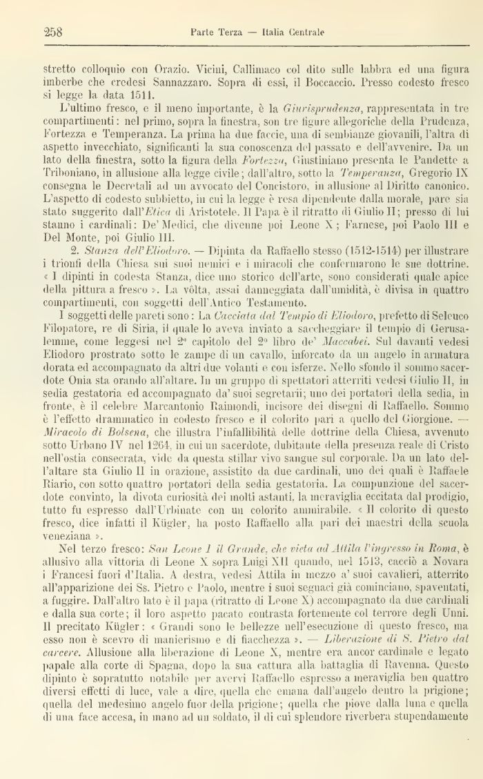 2. Stanza dell'Eliodoro. — Dipìnta da Raffaello stesso (1512-1514) per illustrare i trionfi della Chiesa sin suoi nemici e ì miracoli che confermarono le sue dottrine. « I dipinti in codesta Stanza, dice uno storico dell'arte, sono considerati quale apice della pittura a fresco ». La volta, assai danneggiata dall umidità, è divisa in quattro compartimenti, con soggetti dell \ntico Testamento.