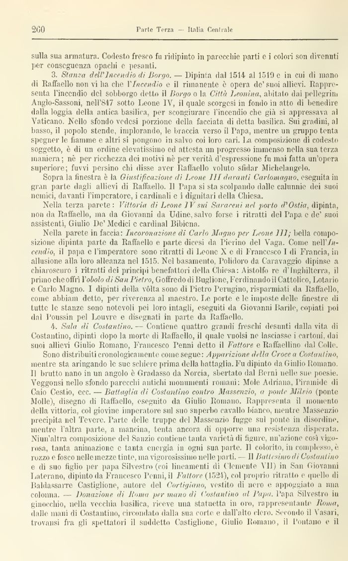 3. Starna dell'Incendio di Borgo. — Dipinta dal 1514 al 1519 e in cui di mano di Raffaello non vi ha che VIncendio e il rimanente è opera de'suoi allievi. Rappresenta l'incendio del sobborgo detto il Borgo, o la Città Leonina, abitato dai pellegrini Anglo-Sassoni, nell'847 sotto Leone IV, il quale scorgesi in fondo in atto di benedire dalla loggia della antica basilica, per scongiurare l'incendio che già si appressava al Vaticano. Nello sfondo vedesi porzione della facciata dì detta basilica. Sui gradini, al basso, il popolo stende, implorando, le braccia verso il Rapa, mentre un gruppo tenta spegner le fiamme e altri si pongono in salvo coi loro cari. La composizione di codesto soggetto, è di un ordine elevatissimo ed attesta un progresso immenso nella sua terza maniera; ne per ricchezza dei motivi ni per verità d'espressione fu mai fatta un'opera superiore; fuvvi persino chi disse aver Raffaello voluto sfidar Michelangelo.