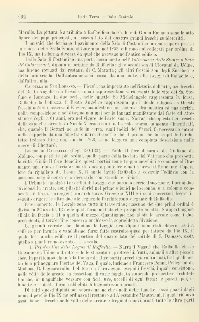 Loggie di Raffaello (figg. 130-133). — Paolo II fece decorare da Giuliano da Maiano, con portici a jnu ordini, quella parte della facciata del Vaticano che prospetta la città; Giulio II fece demolire questi portici come troppo meschini e commi® al Bramante inni nuova facciata; morto questo pontefice e indi a breve il Bramante, l'opera loro fu ripigliala da Leone X il quale invitò Raffaello a costruir l'edifizio con la massima magnificenza e a decorarlo con stucchi e dipinti.