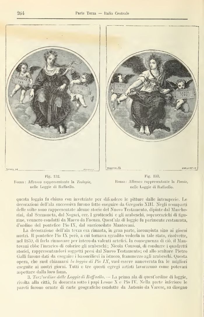 questi loggia fu chiusa con invetriate pei difendere le pitture dalle intemperie. Le decorazioni dell'ala successiva furono fatte eseguire da Gregorio XIII. Negli scompartì delle vòlte sono rappresentate alcune storie del Nuovo Testamento, dipinte dal Masche-rini, dal Scrjaonota, dal Nogari, ecc. 1 grotteschi e gli arabeschi, sopraccarichi di tigu-rine, vennero condotti da Marco da Faenza. Quest'ala di loggie fu parimente restaurata, d'ordine del pontefice Pio IX, dal surricordato Mantovani.