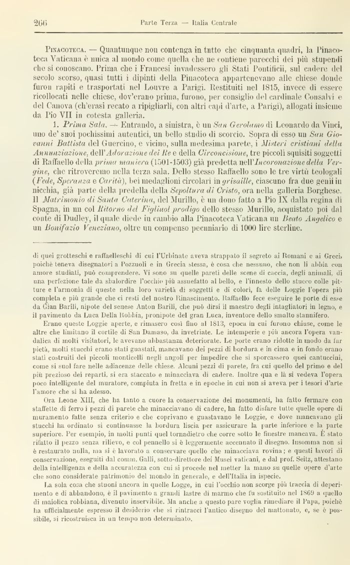 1. Prima Sala. Entrando, a sinistra, è un San Gerolamo di Leonardo da Vinci, uno de' suoi pochissimi autentici, un bello studio di scorcio. Sopra di esso un San Giovanili Battista del Quercino, e vicino, sulla medesima parete, i Misteri cristiani della Annunziazione. dell' Adorazione dei Re e della Circoncisione, tre piccoli squisiti soggetti di Raffaello della prima maniera (1501-1503) già predetta w:\Y Incoronazione della Vergine, che ritroveremo nella terza sala. Dello stesso Raffaello sono le tre virtù teologali {Fede, Speranza e Carità), bei medaglioni circolari in grisù il le, ciascuno fra due gemi in nicchia, già parte della predella della Sepoltura di Cristo, ora nella galleria Borghese. Il Matrimonio di Santa Caterina, del Murillo, è un dono fatto a Pio IX dalla regina ili Spagna, in un col Ritorno del Figlimi prodigo dello stesso .Mimilo, acquistato poi dal conte di Dudley, il quale diede ut cambio alla Pinacoteca Vaticana un Beato Angelico e un Bonifazio Veneziano, oltre un compenso pecuniario di 100(J lire sterline.