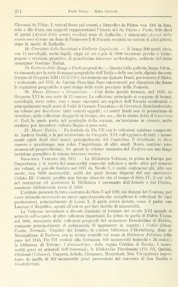 Biblioteca Vaticana (fig. 141). — La Biblioteca Vaticana, la prima in Europa per l'importanza e la rarità dei manoscritti comecché inferiore a molte altre pel ninnerò dei volumi, si può dir fondata nel 1447 da Nicolò V, e vuoisi contenesse già, alla sua morte, ben 9000 manoscritti, molti dei quali furono dispersi dal suo successore Calisto III. Codeste perdite non furono risarcite che al tempo di Sisto IV, il cui zelo nel restaurare ed accrescere la Biblioteca è encomiato dall'Ariosto e dal Platina, nominato bibliotecario verso il 1480.