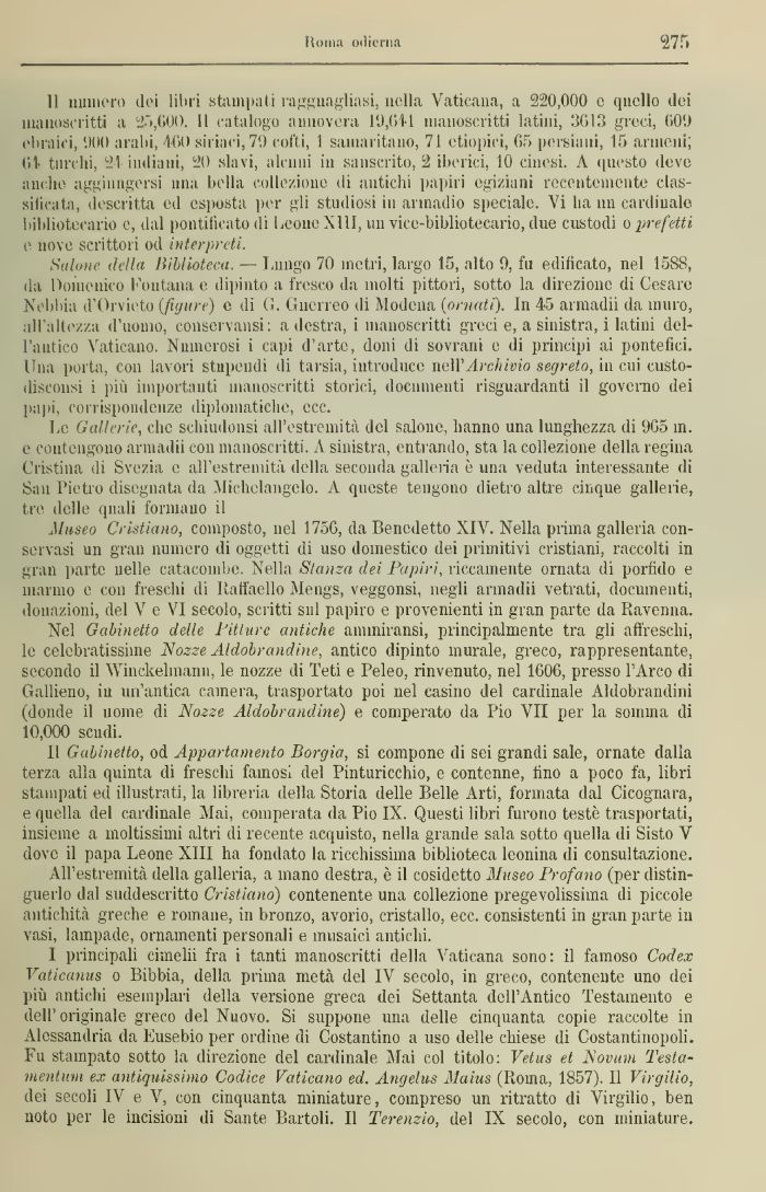 Il ninnwo dei libri Stampali ragguagliasi» nella Vaticana, a 220,000 e quello dei manoscritti a 36,601! Il catalogo annovera l'J,(>ì-1 manoscritti latini, 3613 greci, 600 ebraici, '.100 arabi, 460 siriaci, 7(.) colti, 1 samaritano, 71 etiopici, 65 persiani, 15 armeni, (il turchi, iM indiani, 20 .slavi, aldini in sanscrito, 2 iberici, 10 cinesi. A questo deve anche aggiungersi ima bella collezione di antichi papiri egiziani recentemente classificata, descritta ed esposta per gli studiosi in armadio speciale. Vi ha mi cardinale bibliotecario e, dal pontificato di Leone XIII, un vice-bibliotecario, due custodi o prefetti e nove scrittori od interpreti.