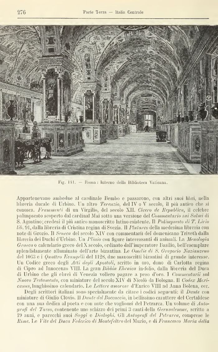 Appartenevano ambedue al cardinale Bembo e passarono, con altri suoi libri, nella libreria ducale di Urbino. Un altro Terenzio, del IV o V secolo, il più antico che si conosca. Frammenti di un Virgilio, del secolo XII. Cicero de Republica, il celebre palimpsesto scoperto dal cardinal Mai sotto una versione del Commentario sui Salmi di S. Agostino; credesi il più antico manoscritto latino esistente. Il Palimpsesto di T, lAvio Uh. 91, dalla libreria di Cristina regina di Svezia. Il Plutarco della medesima libreria con note di Grozio. Il Seneca del secolo XIV con commentarli del domenicano Triveth dalla libreria dei Ducili d'Urbino. Un Plinio con figure interessanti di animali. La Menologia Graeca o calendario greco del X secolo, ordinato dall'imperatore Basilio, bell'esemplare splendidamente alluminato dell'arte bizantina. Le Omelie di S. Gregorio Nazianzeno del 10G3 e i Quattro Evangelii del 1128, due manoscritti bizantini di grande interesse. Un Codice greco degli Atti degli Apostoli, scritto in oro, dono di Carlotta regina di Cipro ad Innocenzo VIII. La gran Bibbia Ebraica in-folio, dalla libreria del Duca di Urbino che gli ebrei di Venezia vollero pagare a peso d'oro. 1 Commentarli sul Nuovo Testamento, con miniature del secolo XIV di Nicolò da Bologna. Il Codex Mexi-m?m, luiiglAiiuo calendario. Le Lettere amorose d'Enrico Vili ad Anna Bolena, ecc.