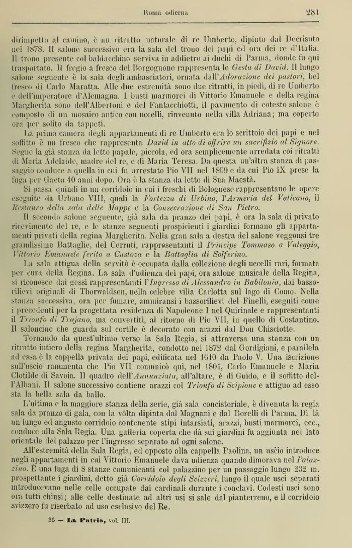 All'estremità della Sala Regia, ed opposto alla cappella Paolina, un uscio introduce negli appartamenti in cui Vittorio Emanuele dava udienza quando dimorava nel Palaz-zino. E una fuga di 8 stanze comunicanti col palazzine per un passaggio lungo 232 111. prospettante i giardini, detto già Corridoio degli Svizzeri, lungo il quale usci separati introducevano nelle celle occupate dai cardinali durante i conclavi. Codesti usci sono ora tutti chiusi ; alle celle destinate ad altri usi si sale dal pianterreno, e il corridoio svizzero fu riserbato ad uso eselusivo del Ile.