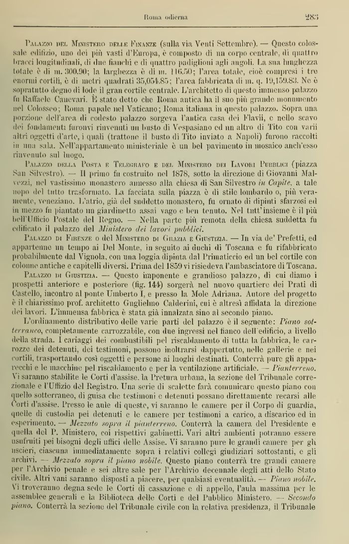 Palazzo dei, KThhstriio delie Finanze (sulla via Venti Settembre).— Questo colossale edilizio, uno dei più vasti d'Europa, e composto di 1111 corpo centrale, di quattro bracci longitudinali, di due fianchi e di quattro padiglioni agli angoli, La sua lunghezza totale è di in. 300.90; la larghezza è di in. LM>.5(); l'area totale, cioè compresi i tre enormi cortili, è di metri quadrati 35,054.85; l'area fabbricata di in. q. 19,150.83. Ne è sopratntt-o degno di lode il gran cortile centrale. L'architetto di questo immenso palazzo fu Ralì'aele Cauevari, È stato detto che Roma antica Iva il suo pin grande monumento nel Colosseo; Roma papale nel Vaticano; Roma italiana 111 questo palazzo. Sopra una porzione dell area di codesto palazzo sorgeva l'antica casa dei Flavi), e nello scavo dei fondamenti furonvi rinvenuti un busto di Vespasiano ed 1111 altro ili Tito con farii altri oggetti d'arte, i quali (trattone il busto di Tito inviato a Napoli) furono raccolti in una sala. Nell'appartamento ministeriale è un bel pavimento in mosaico anch'esso rinvenuto sul luogo.