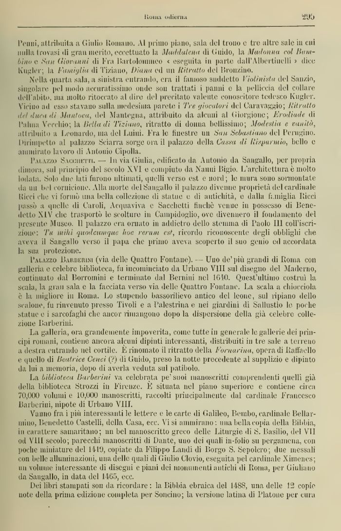 Nella quarta sala, a sinistra entrando, era il famoso suddetto Violinista del Sanzio, singolare pel modo accuratissimo onde son trattati i panni e la pelliccia del collare dell'abito, ma molto ritoccato al dire di 1 precitato valente conoscitore tedesco Kugler. Vicino ad esso stavano sulla medesima parete i i re giocatori del Caravaggio; Hitratlo del duca di Mantova, tiri Mantegna, attribuito da alcuni al Giorgione; Erodiutle di l'alma Vecchio; la lìdia di 'Viziano, ritratto di donna bellissimo; Modestia e vanità, attribuito a Leonardo, ma del Ialini. Fra le finestre un San Sebastiano del Perugino. Dirimpetto al palazzo Sciarra sorge ora il palazzo della Cassa ili Risparmio, bello e ammiralo lavoro di \titanio Cipolla.