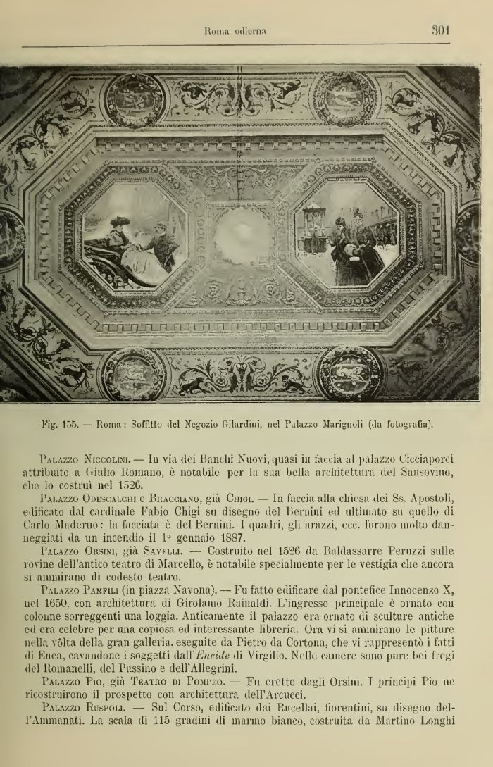 Palazzo Rusi'oli. — Sul Corso, edificato dai Rucellai, fiorentini, su disegno dell'Alluminati. La scala di 115 gradini di marmo bianco, costruita da Martino Longhi