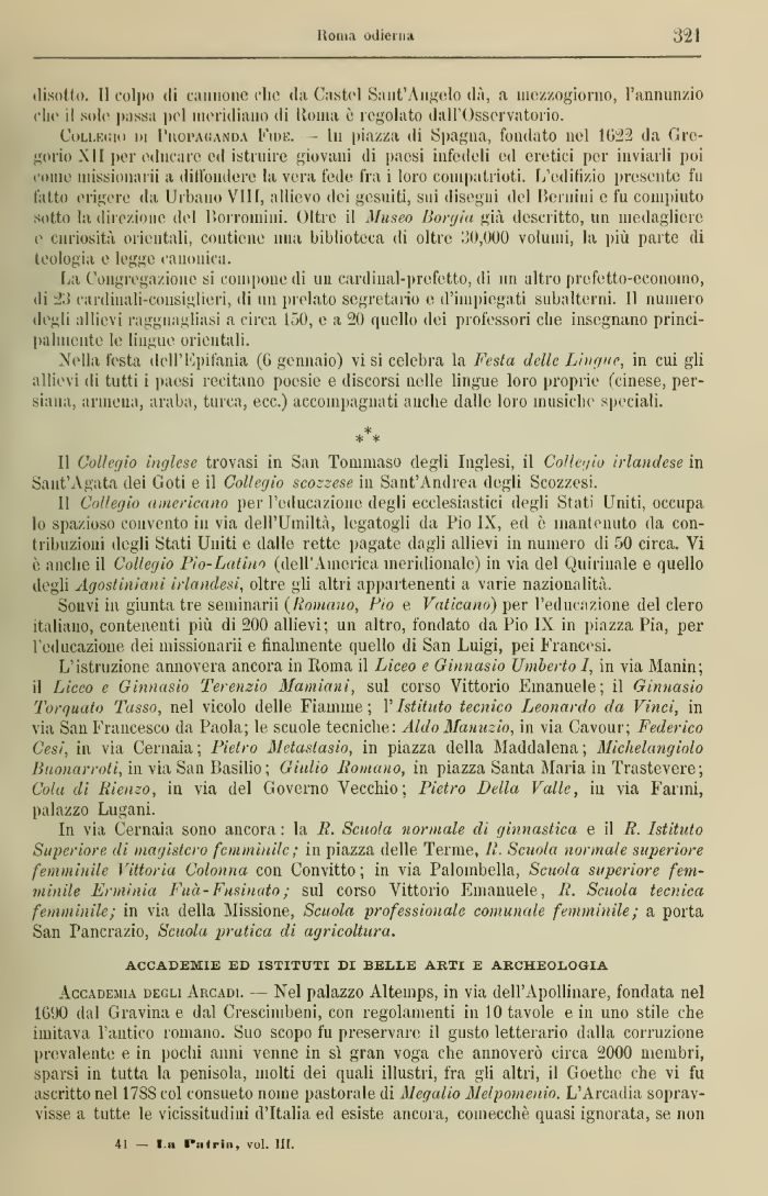 10 spazioso convento in vìa dell'Umiltà, legatogli da l'io IX, ed e mantenuta ila contribuzioni degli Stati Uniti e dalle rette pagate dagli allievi in numero di .50 circa. Vi è anche il Collegio Pio-Latino (dell'America meridionale) in via del Quirinale e quello degli Agostiniani irlandesi, oltre gli altri appartenenti a varie nazionalità.