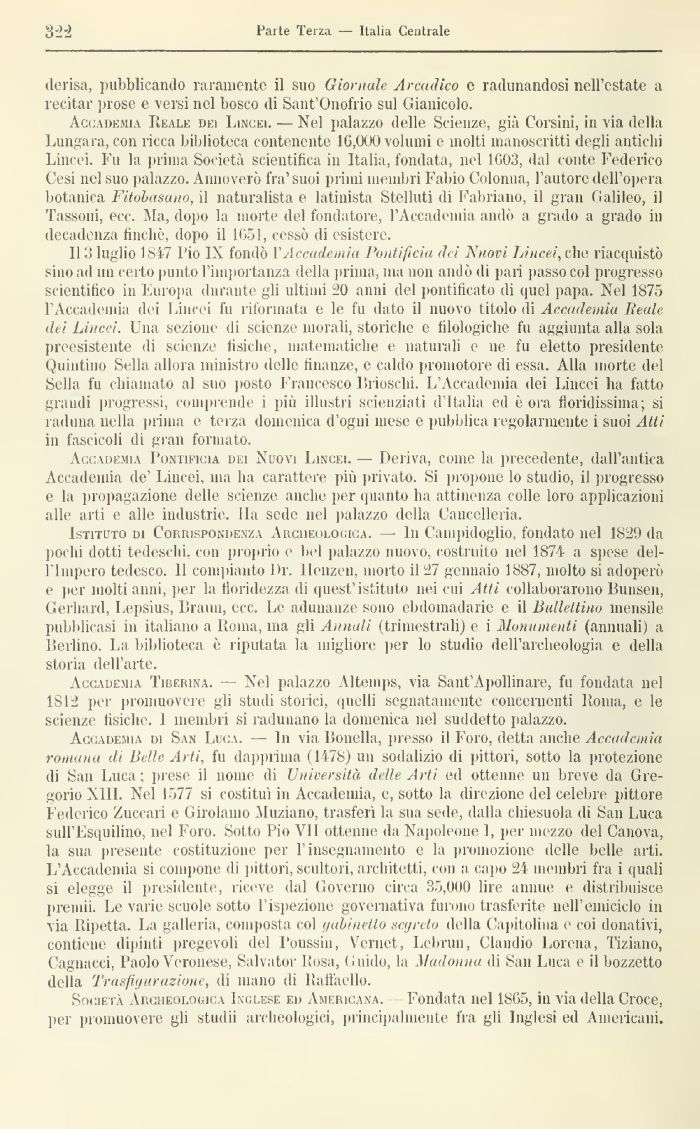 Accademia Pontificia dei Nuovi Lincei. — Deriva, come la precedente, dall'antica Accademia de' Lincei, ma ha carattere più privato. Si propone lo studio, il progresso e la propagazione delle scienze anche per quanto ha attinenza colle loro applicazioni alle arti e alle industrie. Ila sede nel palazzo della Cancelleria.