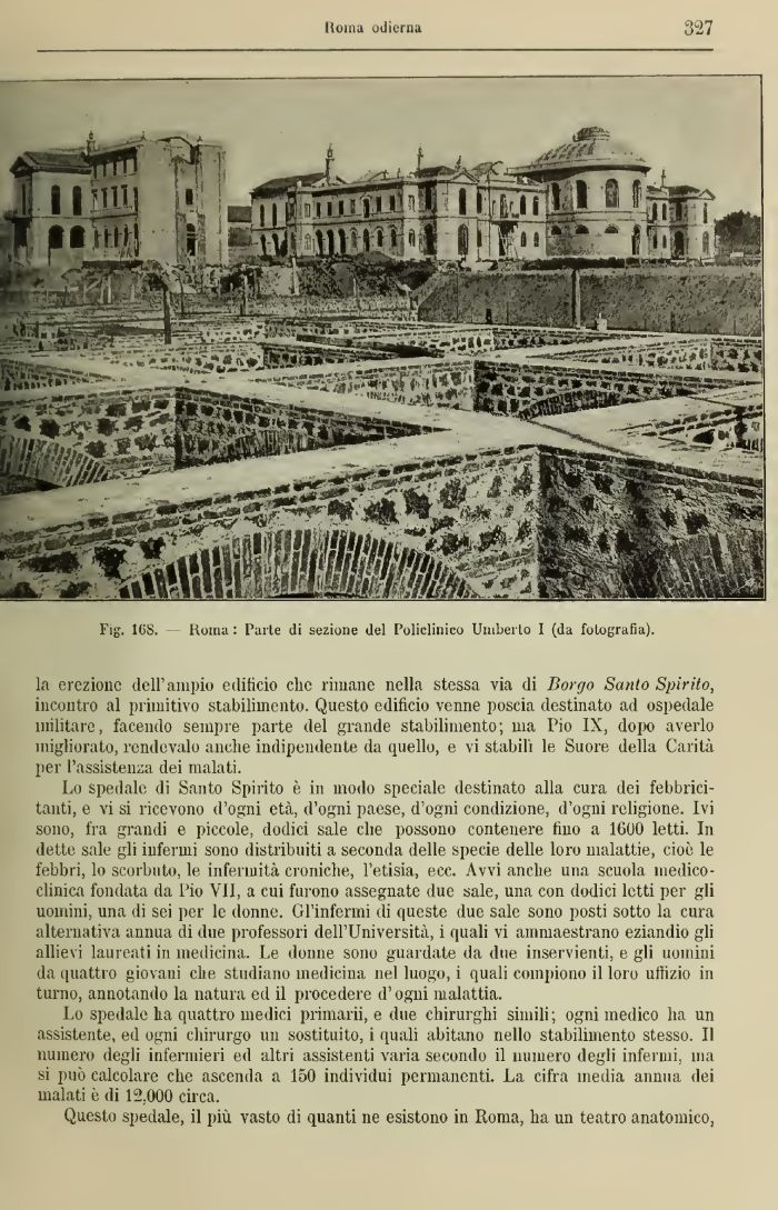 Lo spedale di Santo Spirito è in modo speciale destinato alla cura dei febbricitanti, e vi si ricevono d'ogni età, d'ogni paese, d'ogni condizione, d'ogni religione. Ivi sono, fra grandi e piccole, dodici sale che possono contenere tino a 1000 letti. In dette sale gli iuferuii sono distribuiti a seconda delle specie delle loro malattie, cioè le febbri, lo scorbuto, le infermità croniche, l'etisia, ecc. Avvi anche una scuola medico-clinica fondata da Pio VII, a cui furono assegnate due sale, una con dodici letti per gli uomini, una di sei per le donne. Gl'infermi di queste due sale sono posti sotto la cura alternativa annua di due professori dell'Università, i quali vi ammaestrano eziandio gli allievi laureati in medicina. Le donne sono guardate da due inservienti, e gli uomini da quatti® giovani che studiano medicina nel luogo, i quali compiono il loro uffizio in turno, annotando la natura ed il procedere d'ogni malattia.