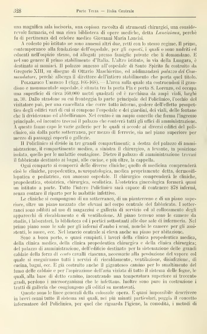 11 Policlinico si divide in tre grandi compartimenti; a destra del palazzo di amministrazione, il compartimento medico, a sinistra il chirurgico, a levante, in posizione isolata, quello per le malattie contagiose. Dietro il palazzo di amministrazione trovasi il fabbricato destinato ai bagni, alle cucine, e più oltre, la cappella.