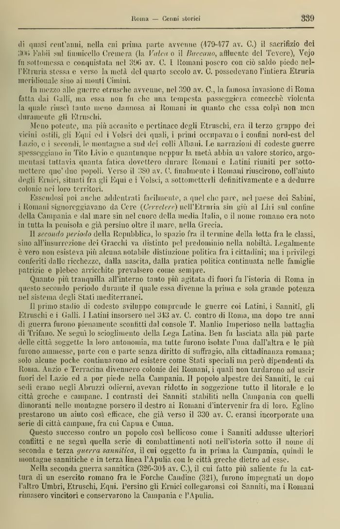 Il pruno stadio di codesto sviluppo comprende le guerre coi Latini, i Sanniti, gli Etruschi e i Galli. I Latini insorsero nel 313 av. C. contro di Roma, ma dopo tre anni di guerra furono pienamente sconfitti dal console T. Manlio Imperioso nella battaglia di l'rifano. Ne seguì lo scioglimento della Lega Latina. Ben fu lasciata alla più parte delle città soggette la loro autonomia, ma tutte furono isolate l'ima dall'altra e le più furono ammesse, parte con e parte senza diritto di suffragio, alla cittadinanza romana; solo alcune poche continuarono ad esistere come Stati speciali ma però dipendenti da Roma. Anzio e Terracina divennero colonie dei Romani, i quali non tardarono ad uscir fuori del Lazio ed a por piede nella Campania. Il popolo alpestre dei Satiniti, le cui sed erano negli Abruzzi odierni, avevan ridotto in soggezione tutto il litorale e lo città greche e campane. 1 contrasti dei Sanniti stabiliti nella Campania con quelli dimoranti nelle montagne porsero il destro ai Romani d'intervenir fra di loro. Eglino prestarono un aiuto così efficace, che già verso il 330 av. C. eransi incorporate una serie di città campane, fra cui Capua e Clima.