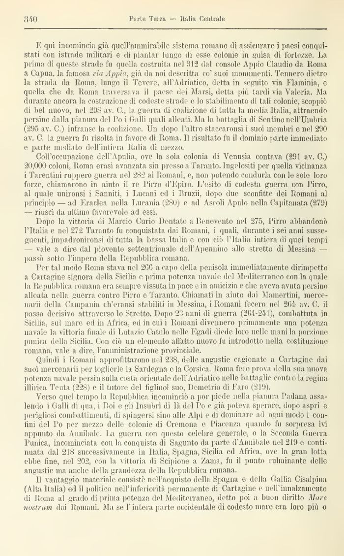 E qui incomincia già quell'ammirabile sistema romano di assicurare i paesi conquistati con istrado militari e di piantar lungo di esse colonie in guisa di fortezze. Là prima di queste strade fu quella costruita nel 312 dal console Appio Claudio da ltoma a Capua, la famosa viaAppia, già da noi descritta co' suoi monumenti Tennero dietro la strada da Itoma, lungo il Tevere, all'Adriatico, detta in seguito via Flamini!! e quella che da Roma traversava il paese dei Marsi, detta più tardi via Valeria. Ma duranti ancora la costruzione di codeste strade e lo stabilimento di tali colonie, scoppiò di bel nuovo, nel 29S av. C., la guèrra di coalizione di tutta la media Italia, attraendo persino dalla pianura del Po i Galli quali alleati, ila la battaglia di Settimo nell'Umbria (295 av. C.) infranse la coalizione. Un dopo l'altro st.accaronsi i suoi membri e nel 290 av. C, la guerra fu risolta in favore di Roma. Il risultato fu il dominio parte immediato e parte mediato dell'intiera Italia di mezzo.