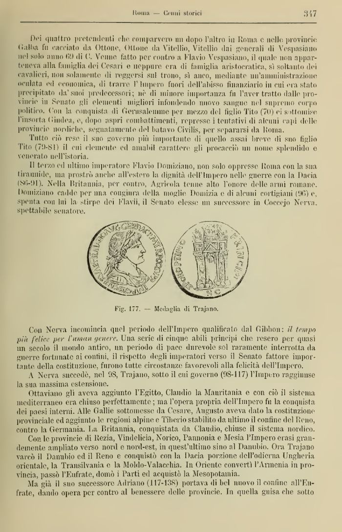 11 terzo ed ultimo imperatore Flavio Domiziano, non solo oppresse Roma con la sua tirannide, ma prostrò anello ali estero la dignità dell'Impero nelle guerre con la Dacia (SG-'.)l). Nella l'ritaniiia, per contro, Agricola tenne alto l'onore delle anni romane. Domiziano cadde per una congiura della moglie Doniizia e di alcuni cortigiani (!)f.) e, spenta con Ini la stirpe dei Flavii, il Senato elesse un successore in Coccejo Nerva. spettabile senatore.