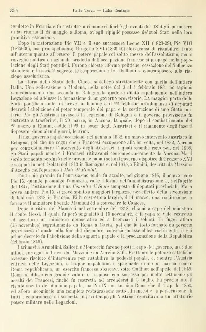 I triumviri Armellini, Saliceti e Montecclii furono posti a capo del governo, ma i due ultimi, surrogati in breve dal Mazzini e da Aurelio Saffi. Frattanto le potenze cattoliche avevano risoluto d'intervenire per ristabilire la podestà .papale, e, mentre l'Austria entrava nelle Legazioni, e truppe napoletane e spaglinole erano in marcia contro Roma repubblicana, un esercito francese sbarcava sotto Oudinot nell'aprile lei 1S49. Roma si difese con grande valore e respinse con successo per molte settimane gli assalti dei Francesi, finché fu costretta ad arrendersi il 3 luglio. Fu proclamato il ristabilimento del dominio papale, ma Pio IX non tornò a Roma che il 4 aprile 185U, ed allora incominciò una completa restaurazione sotto i Francesi e la persecuzione di tutti i compromessi e i sospetti. In pari tempo gii Austriaci esercitavano un arbitrano potere militare nelle Legazioni.