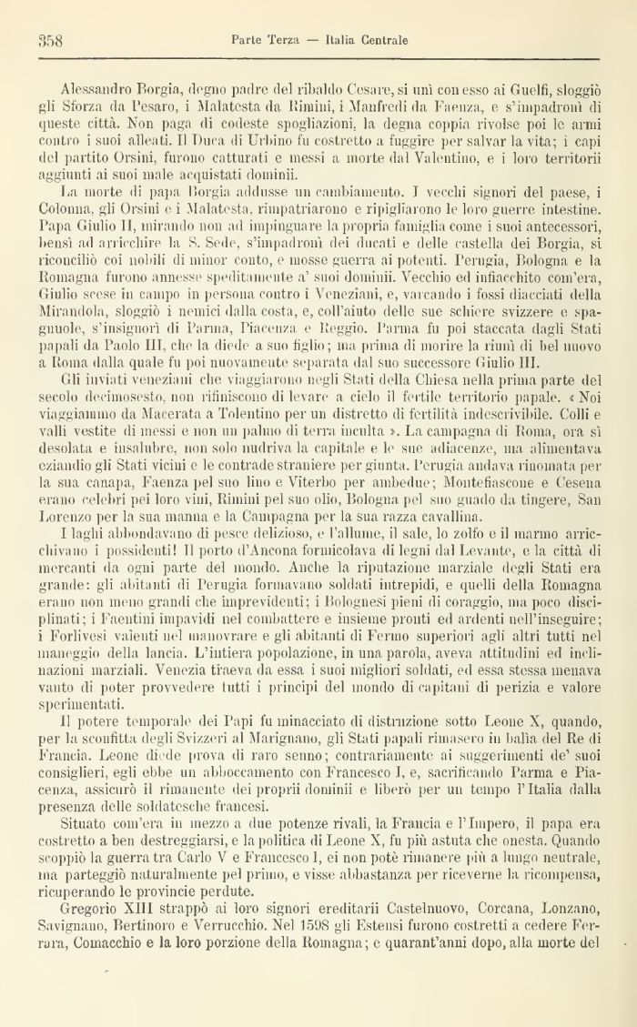 La morte di papa Borgia addusse un cambiamento. I vecchi signori del paese, i Colonna, gii Orsini e i .Malatesta. rimpatriarono e ripigliarono le loro guerre intestine. Papa Giulio lì, mirando non ad impinguare la propria famiglia come i suoi antecessori, bensì ad arricchire la S. Sede, s'impadronì dei ducati e delle castella dei Borgia, si riconciliò coi nobili di minor conto, e mosse guerra ai potenti. Perugia, Bologna e la Romagna furono annesse speditamente a' suoi domimi. Vecchio ed infiacchito com'era, Giulio scese in campo ili persona contro i Veneziani, e, varcando i fossi diacciati della Mirandola, sloggiò i nemici dalla costa, e, col l'aiuto delle sue schiere svizzere e spaglinole, s'insignorì di Parma, Piacenza e Peggio. l'arma fu poi staccata dagli Stati papali da Paolo III, che la diede a suo figlio; ma prima di morire la riunì di bel nuovo a Roma dalla quale fu poi nuovamente separata dal suo successore Giulio III.