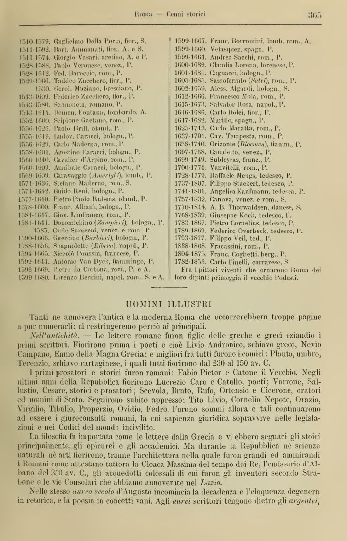 15S5. Carlo Saraceni, venez. e rom., 1'. l'i!)0-1660. Guercino (OtirOinri), bologn., P. 15N8-1656. Spagnoletto (lìihera), napol., P. 1504-1665. Niccolò Poussin, francese, P. 15!)'.)-10tl. Antonio Van Dyck, fiammingo, P. 1596 1661). l'ietro da Cnilona, rom., P. e A. 15111)-11180. Lorenzo Bernini, napol. rom.. S. e A.
