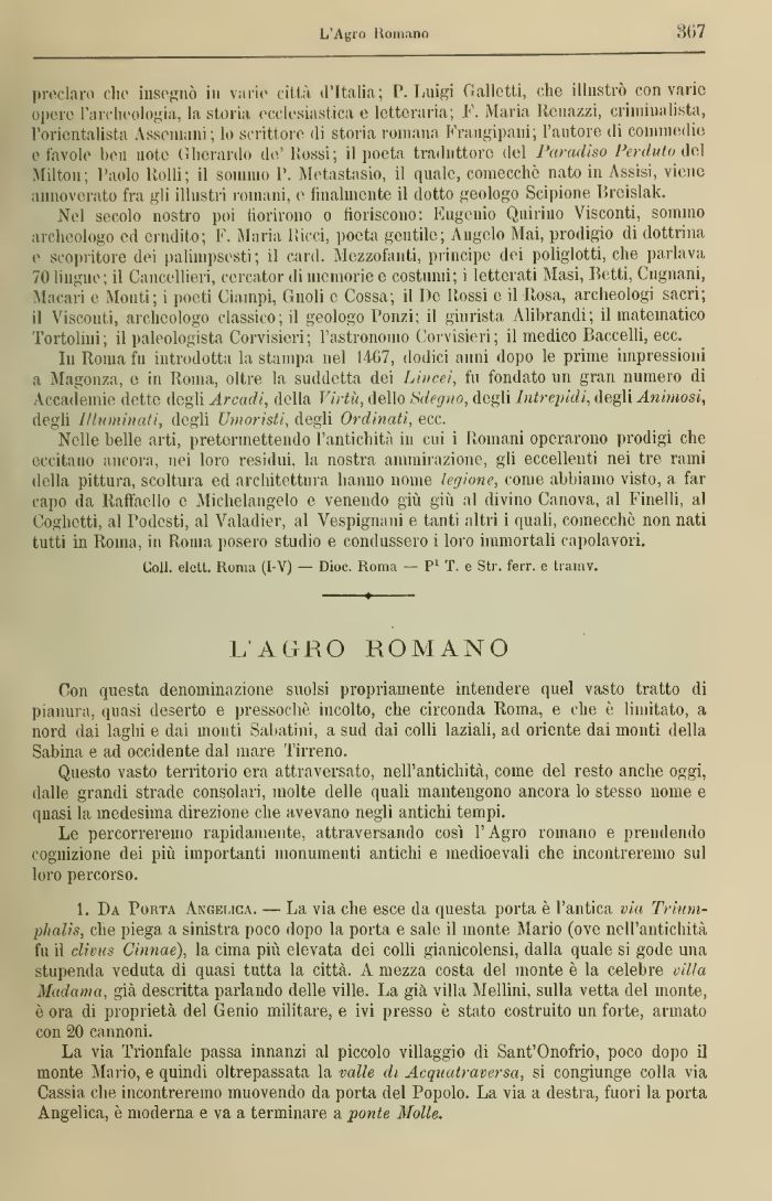 Nel secolo nostro poi fiorirono o fioriscono: Eugenio Quirino Visconti, sommo archeologo ed erudito; F. Maria lìicci, poeta gentile; Angelo Mai, prodigio di dottrina e scopritore dei paliinpsesti; il card. Mezzofanti, principe dei poliglotti, che parlava 70 lingue; il Cancellieri, cercator di memorie e costumi; i letterati Masi, Retti, Cugnani, Macari e Monti; i poeti Ciampi, Gnoli e Cossa; il I)e Rossi e il Rosa, archeologi sacri; il Visconti, archeologo classico; il geologo l'onzi; il giurista Abbrunili; il matematico Tortolini; il paleologista Corvisieri; l'astronomo Corvisieri; il medico Baccelli, ecc.