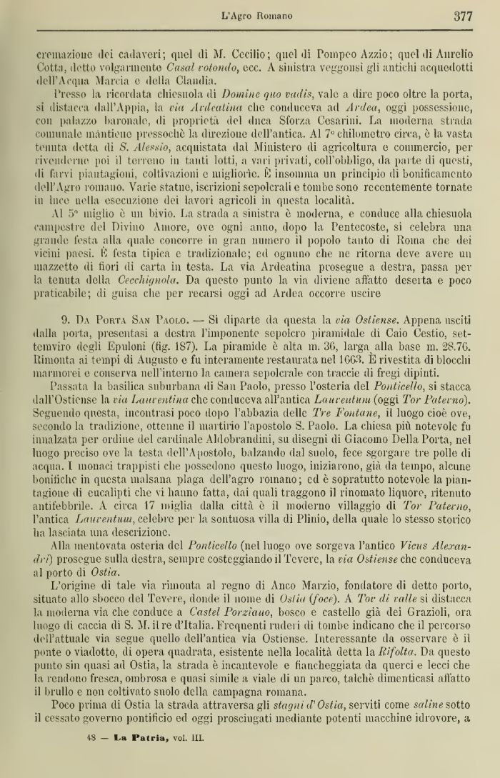 Passata la basilica suburbana di San Paolo, presso l'osteria del Ponticello, si stacca dall'Ostiense la via Laurentina clic conduceva all'antica Laaveutum (oggi 'Por Paterno). Seguendo questa, incontrasi poco dopo l'abbazia delle Tre Fontane, il luogo cioè ove, secondo la tradizione, ottenne il martirio l'apostolo S. Paolo. La chiesa più notevole fu innalzata per ordine del cardinale Aldobrandìiii, su disegni di Giacomo Della Porta, nel luogo preciso ove la testa dell'Apostolo, balzando dal suolo, fece sgorgare tre polle di acqua. I monaci trappisti che possedono questo luogo, iniziarono, già da tempo, alcune bonifiche in questa malsana plaga dell'agro romano; ed è sopratutto notevole la piantagione di eucalipti che vi Iranno fatta, dai quali traggono il rinomato liquore, ritenuto antifebbrile. A circa 17 miglia dalla città è il moderno villaggio di 'Por P'aterno, l'antica Lauventilili, celebre per la sontuosa villa di Plinio, della quale lo stesso storico lia lasciata una descrizione.