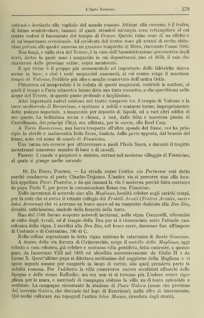 10. Da Porta Portese. — La strada segue l'antica via Porhtense così detta perchè conduceva al porto Claudio-Trajaneo. L'antica via si percorre sino alla località appellata Pozzo Pantaleo, e da qui innanzi la via è moderna perchè fatta costruire da papa Paolo V, per porre in comunicazione Roma con Fiumicino.