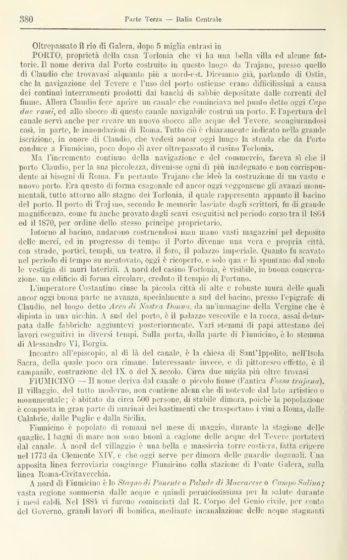 PORTO, proprietà della casa Torlonia che vi ha una 1 iella villa ed alcune fattorie. 11 nome deriva dal Porto costruito in questo luogo da Trajano, presso quello di Claudio che frovavasi alquanto più a nord-est,. Dicemmo già, parlando di Ostia, che la navigazione del Tevere e l'uso del porto ostiense erano difficilissimi a causa dei continui interramenti prodotti dai banchi di sabbie depositate dalle correnti del filane. Allora Claudio fece aprire un canale che cominciava nel punto detto oggi Capo due rami, ed allo sbocco di questo canale navigabile costruì un porto. E rapatura del canale servì anche per creare un nuovo sbocco alle acque del Tevere, scongiurandosi così, in parte, le innondazioni di Roma. Tutto ciò e chiaramente indicato nella grande iscrizione, in onore di Claudio, che vedesi ancor oggi lungo la strada che da l'orto conduce a Fiumicino, poco dopo di aver oltrepassato il casino Torlonia.