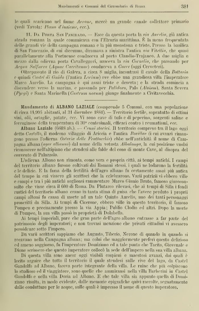 Mandamento di ALBANO LAZIALE (comprende 5 Comuni con una popolazione di circa 11.095 abitanti, al 31 dicembre ISSI). —- Territorio fertile, sopratutto di ottimi vini, olii, ortaglie, patate, ecc. Vi sono cave ili tufo e di peperino, sorgenti saline e ferruginose della temperatura di 30° centesimali, efficaci contro i reumatismi, ecc.
