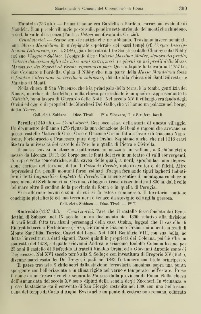 Cenili storici.— Scarse sono le notizie che ne abbiamo. Troviamo invece nominata una Massa Mumietami in un epigrafe sepolcrale dei bassi tempi (cf. Corpus lusrrip-tiouiim Latinorum, xiv, n. 3482), già illustrata dal De Sanctis e dallo Chanpy e dal Nibby nel suo Viaggio a Subiaco. L'epigrafe dice: Valeria Massima Mai/re, signora dedprcdio, Valeria dolcissima figlia che visse anni xxxvi, mesi u e giorni xu neipredii della Massa Mandei.ana dei Scpreti ed l'ir cole, riposano in pace. Questa lapido fu trovata nel 1757 tra San Cosimato e Bardella. Opina il Nibby che ima parte della Massa Mandeìaua fosso d fundits VtdeckiHiià in territorio saliinenst, donato alla, chiesa dei Santi Silvestro e. Martino ai Monti.