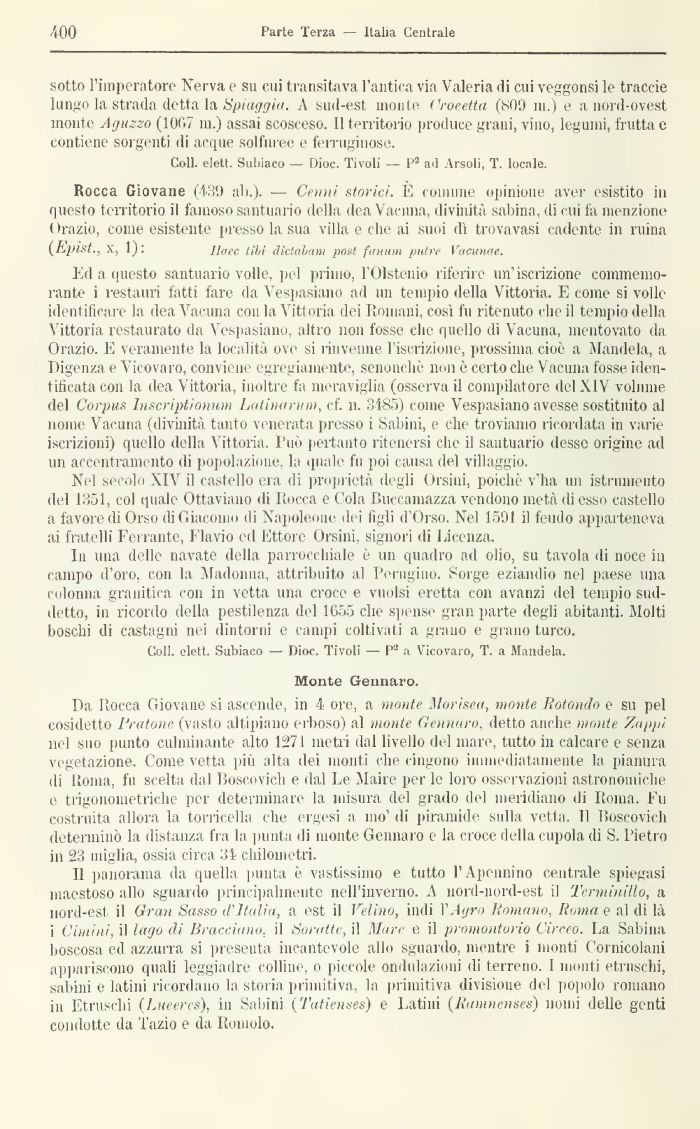 Da Rocca Giovane si ascende, in 4 ore, a monte Morisea, monte. Rotondo e su pel cosidetto Protone (vasto altipiano erboso) al monte Gennaro, detto anche monte Zappi nel suo punto culminante alto 1271 metri dal livello del mare, tutto in calcare e senza vegetazione. Come vetta più alta dei monti che cingono immediatamente la pianura di Roma, fu scelta dal Poscovich e dal Le Maire per le loro osservazioni astronomiche e trigonometriche per determinare la misura del grado del meridiano di Roma. Fu costruita allora la torricella che ergesi a ino' di piramide sulla vetta. Il lìoscovich determinò la distanza fra la punta di monte Gennaro e la croce della cupola di S. Pietro in 23 miglia, ossia circa 34 chilometri.