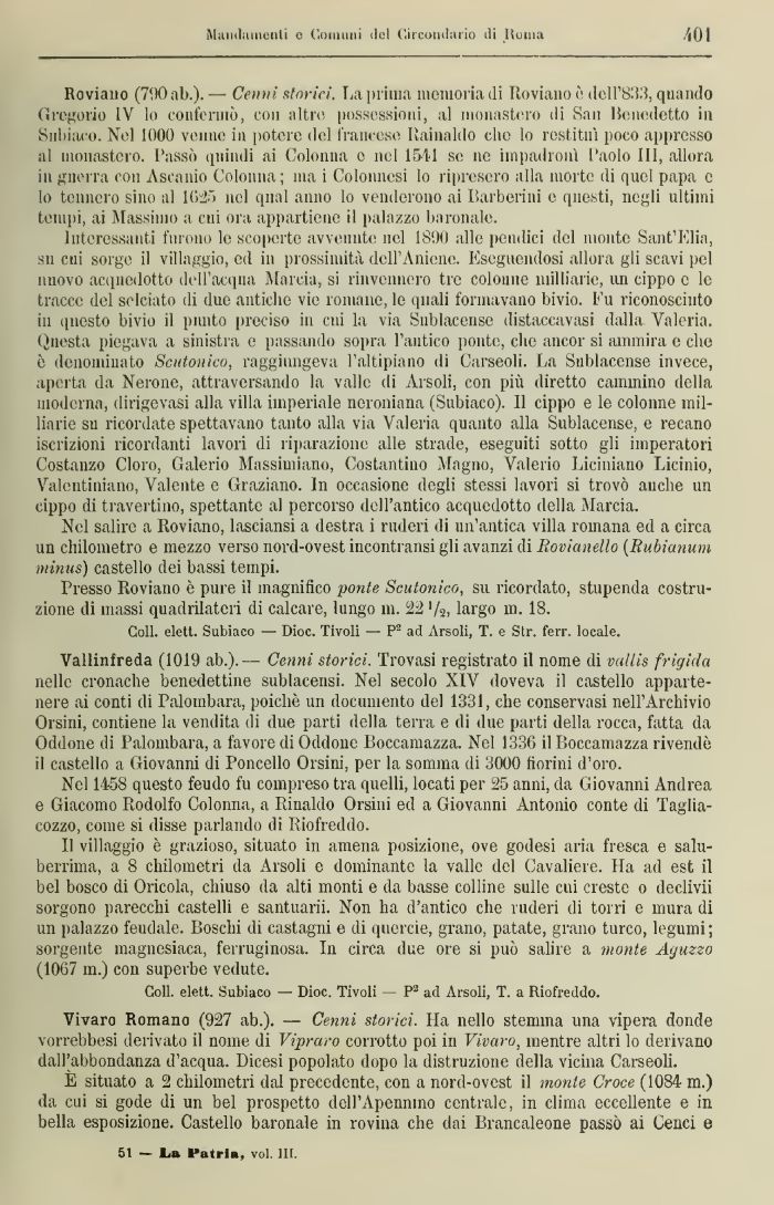 B villaggio è grazioso, situato in amena posizione, ove godesi aria fresca e saluberrima, a 8 chilometri da Arsoli e dominante la valle del Cavaliere. Ha ad est il bel bosco di Oricela, chiuso da alti monti e da basse colline sulle cui creste 0 declivi! sorgono parecchi castelli e santuarii. Non ha d'antico che ruderi di torri e mura di un palazzo feudale. Boschi di castagni e di querele, grano, patate, grano turco, legumi; sorgente magnesiaca, ferruginosa. In circa due ore si può salire a monte Aguzzo (1067 m.) con superbe vedute.