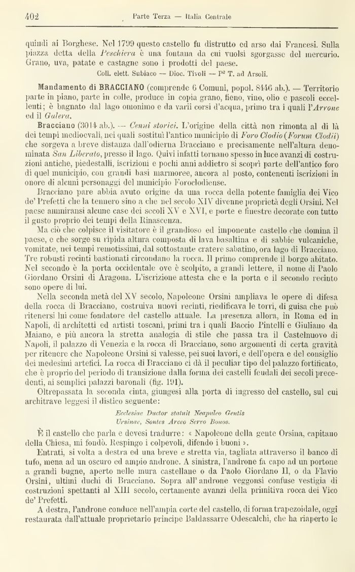 Bracciano (3014 ab.). — Cenni storici. L'origine della città non rimonta al di là dei tempi medioevali, nei quali sostituì l'antico municipio di Foro C/otlio (Forum Clodii) che sorgeva a breve distanza dall'odierna Bracciano e precisamente nell'altura denominata San Liberalo, presso il lago. Quivi infatti tornano spesso in luce avanzi di costruzioni antiche, piedestalli, iscrizioni e pochi anni addietro si scoprì parte dell'antico foro di quel municipio, con grandi basi marmoree, ancora al posto, contenenti iscrizioni in onore di alcuni personaggi del municipio Foroclodiense.