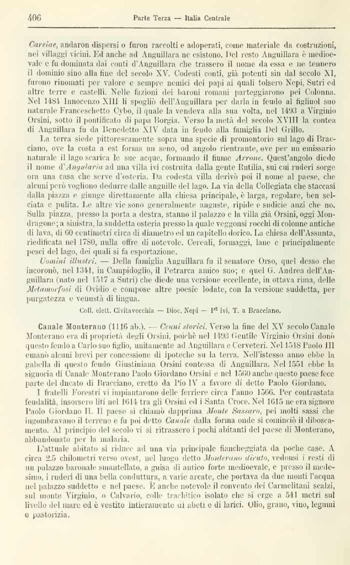 Canale Monterano (1110 ab.). - - Cenni storici. Verso la fine del XV secolo Canale Monterano era di proprietà degli Orsini poiché nel 1403 Gentile Virginio Orsini donò questo feudo a Carlo suo figlio, unitamente ad Viiguillara e Cerveteri. Nel 1518 Paolo III emanò alcuni brevi per concessione di ipoteche sii la terra. Nell'istesso anno ebbe la gabella di questo feudo Giustiniana Orsini contessa di Anguillaia. Nel 1551 ebbe la signoria di Canale Monterano Paolo Giordano Orsini e nel 15G0 anche questo paese fece parte del ducato di Bracciano, eretto da Pio IV a favore di detto Paolo Giordano.