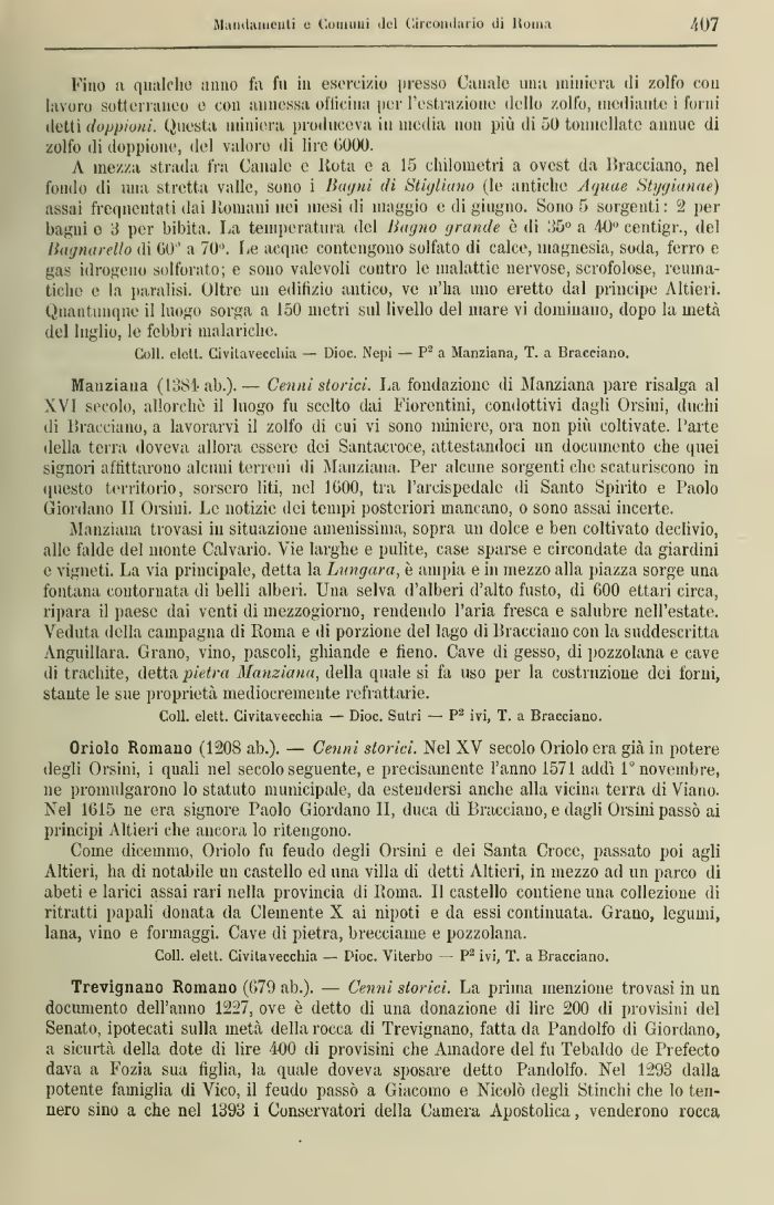 Mauziana (1384 ab.).— Cenni storici. La fondazione di Manziana pare risalga al XVI secolo, allorché il luogo fu scelto dai Fiorentini, condottivi dagli Orsini, duchi ili Bracciano, a lavorarvi il zolfo ili cui vi sono miniere, ora non più coltivate. l'arte della terra doveva allora essere dei Santacroce, attestandoci un documento che quei signori affittarono alcuni terreni di Manziana. Per alcune sorgenti che scaturiscono in questo territorio, sorsero liti, nel 10o0, tra l'arcispedale di Santo Spirito e Paolo Giordano II Orsini. Le notizie dei tempi posteriori mancano, o sono assai incerte.