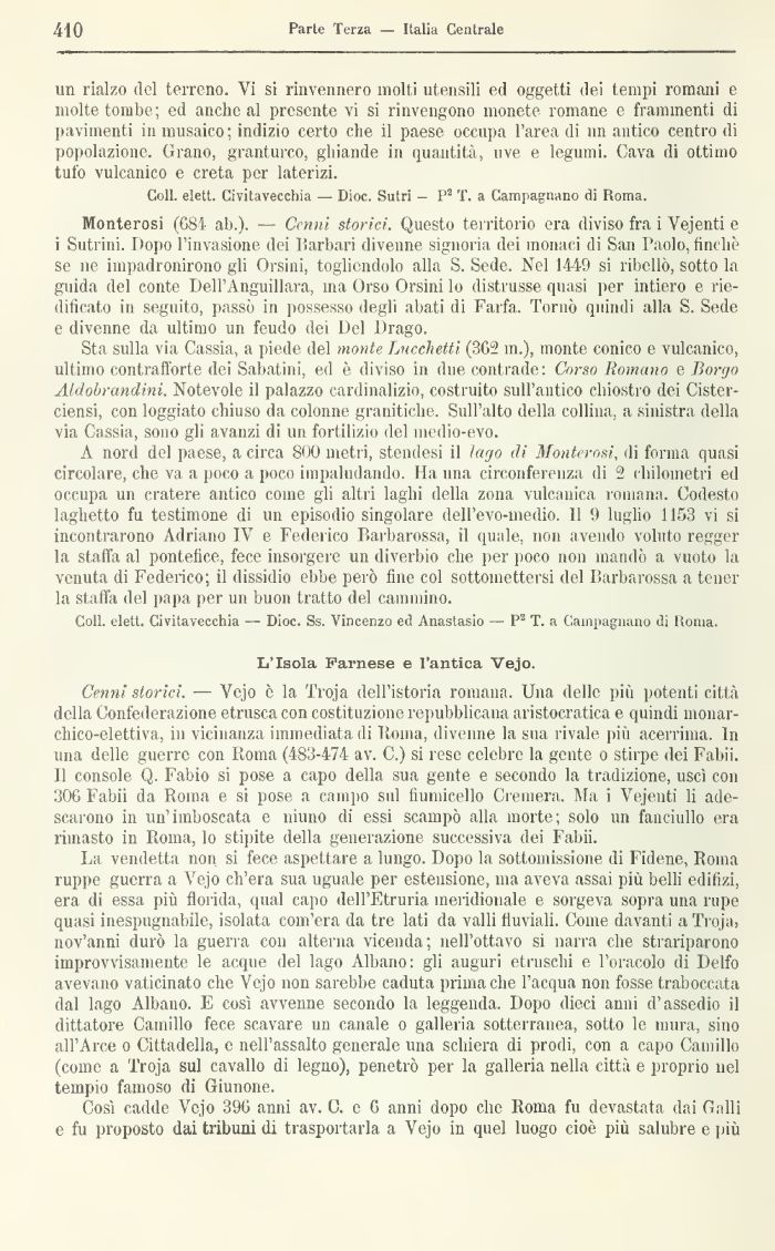 Monterosi (68ì ab.). — Cenni storici. Questo territorio era diviso fra i Vejenti e i Sutrini. Dopo l'invasione dei Barbari divenne signorìa dei monaci di San Paolo, tinche se ne impadronirono gli Orsini, togliendolo alla S. Sede. Nel 1449 si ribellò, sotto la guida del conte Dell'Anguillara, ma Orso Orsini lo distrusse quasi per intiero e riedificato in seguito, passò in possesso degli abati di Farfa. Tornò quindi alla S. Sede e divenne da ultimo un feudo dei Del Drago.