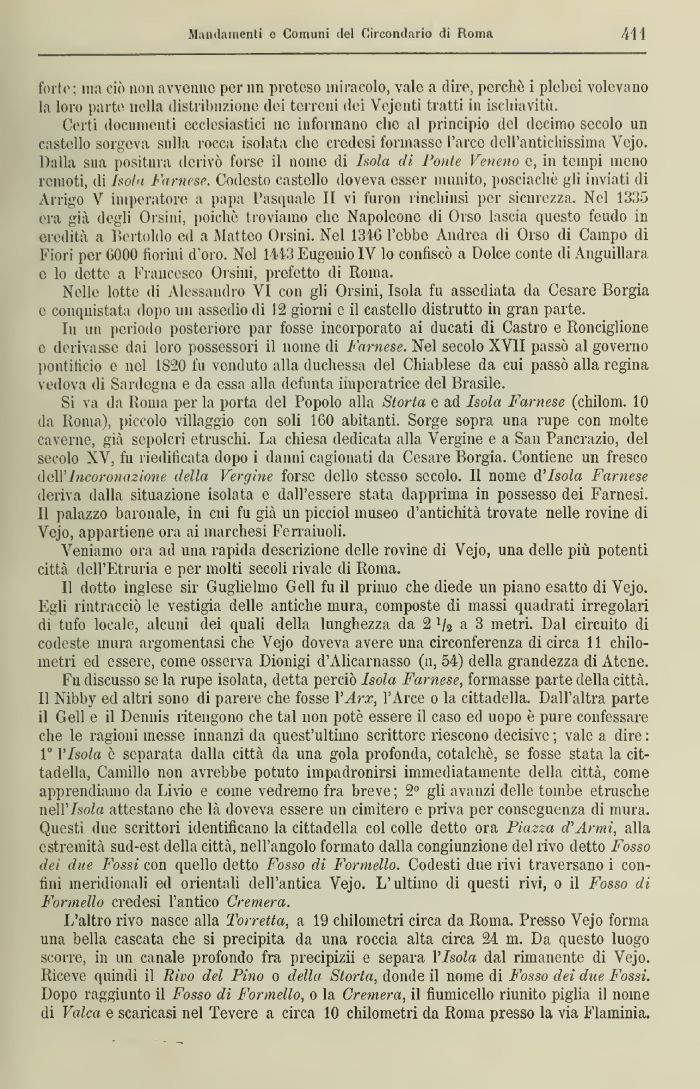 Fu discusso se la rupe isolata, detta perciò Isola Farnese, formasse parte della città. Il Nibbv ed altri sono di parere che fosse l'Ara l'Arce o la cittadella. Dall'altra parte il Geli e il Dennis ritengono che tal non potè essere il caso ed uopo è pure confessare che le ragioni messe innanzi da quest'ultimo scrittore riescono decisive ; vale a dire : 1° VIsola è separata dalla città da una gola profonda, cotalehè, se fosse stata la cittadella, Camillo non avrebbe potuto impadronirsi immediatamente della città, come apprendiamo da Livio e come vedremo fra breve; 2° gli avanzi delle tombe etnische neirIsola attestano che là doveva essere un cimitero e priva per conseguenza di mura. Questi due scrittori identificano la cittadella col colle detto ora Piazza d'Armi, alla estremità sud-est della città, nell'angolo formato dalla congiunzione del rivo detto Fosso dei due. Fossi con quello detto Fosso di Formella. Codesti due rivi traversano i contini meridionali ed orientali dell'antica Vejo. L'ultimo di questi rivi, o il Fosso di l'orniello credesi l'antico Cremerà.
