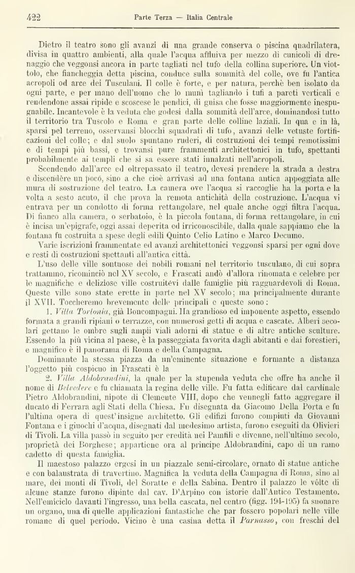 11 maestoso palazzo ergesi ili un piazzale semi-circolare, ornato di statue antiche e con balaustrata di travertino. Magnifica la veduta della Campagna di Roma, sino al mare, dei monti di Tivoli, del Soratte e della Sabina. Dentro il palazzo le vòlte di alcune stanze furono dipinte dal cav. D'Arpino con istorie dall'Antico Testamento. Nell'emiciclo davanti l'ingresso, una bella cascata, nel centro (figg. 194-195) fa suonare un organo, una di quelle applicazioni fantastiche che par fossero popolari nelle ville romane di quel periodo. Vicino è una Casina detta il Parnassi), con freschi del