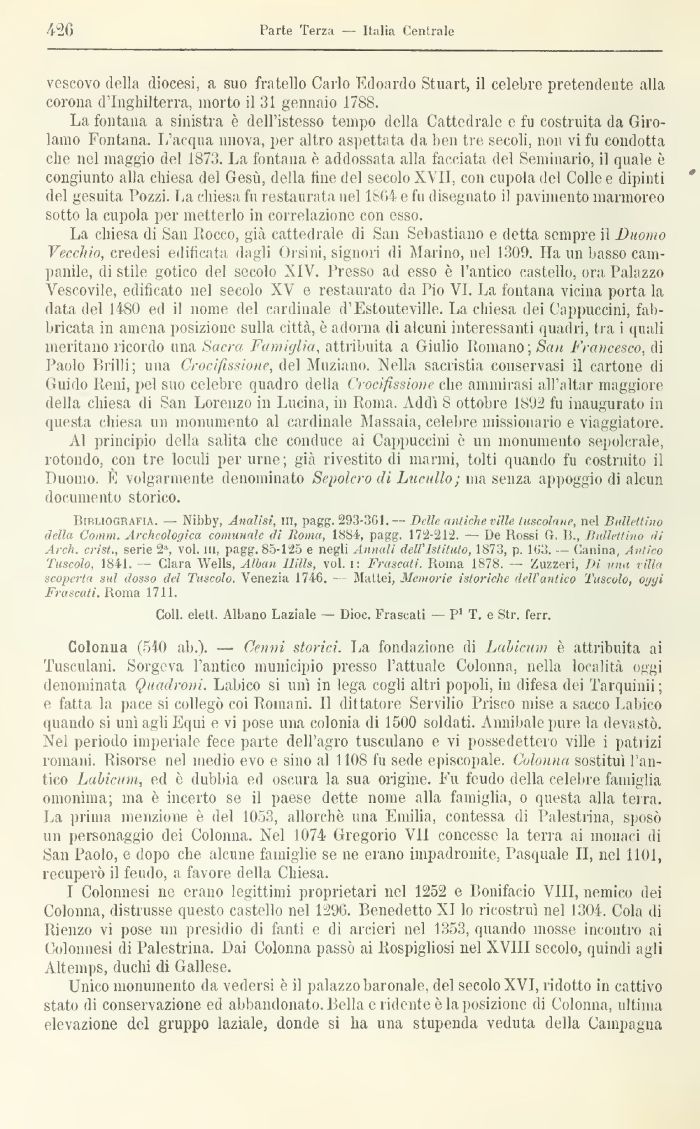 Colonna (540 ab.l — Cenni storici. La fondazione di Labicum è attribuita ai Tusculani. Sorgeva l'antico municipio presso l'attuale Colonna, nella località oggi denominata Quadroni. Labico si unì in lega cogli altri popoli, in difesa dei Tarquinii ; e fatta la pace si collegò coi Romani. Il dittatore Servilio Prisco mise a sacco Labico quando si unì agli Equi e vi pose una colonia di 1500 soldati. Annibale pure la devastò. Nel periodo imperiale fece parte dell'agro tusculano e vi possedettero ville i patrizi romani. Risorse nel medio evo e sino al 1108 fu sede episcopale, Colonna sostituì l'antico Labicum, ed è dubbia, ed oscura la sua origine. Fu feudo della celebre famiglia omonima; ma è incerto se il paese dette nome alla famiglia, o questa alla terra. La prima menzione è del 1053, allorché una Emilia, contessa di Palestrina, sposò un personaggio dei Colonna. Nel 1074 Gregorio VII concesse la terra ai monaci di San Paolo, e dopo che alcune famiglie se ne erano impadronite, Pasquale II, nel 1101, recuperò il feudo, a favore della Chiesa.