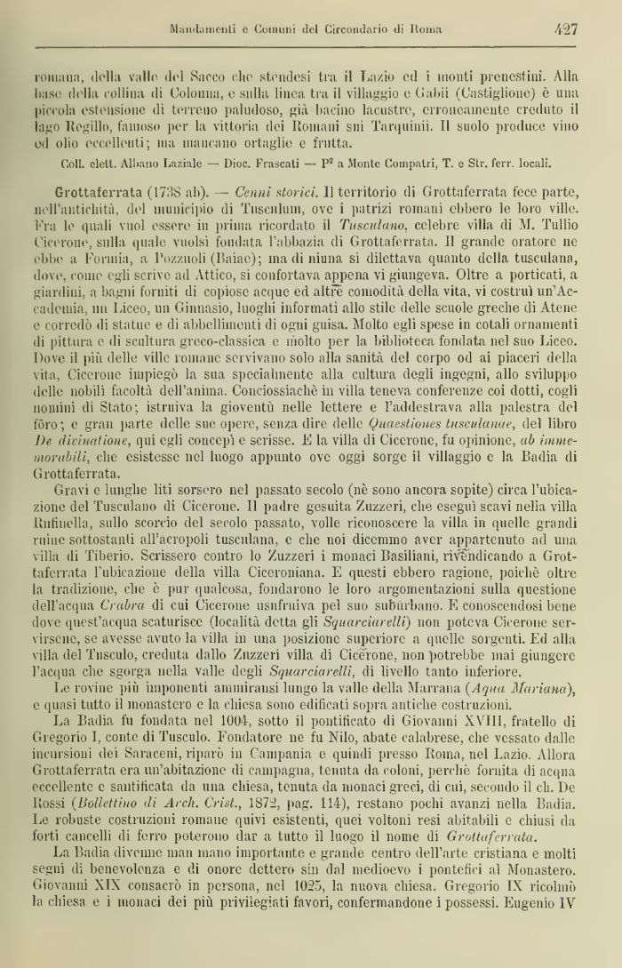 Grottaferrata (1738 ab). — Cenni storici. 11 territorio di Grottaferrata fece parte, nell'antichità, del municipio di Tuseiilum, ove i patrizi romani ebbero le loro ville, fra le quali vuol essere in prima ricordato il Tusculano, celebre villa di M. Tullio Cicerone, sulla quale vuoisi fondata l'abbazia di Grottaferrata. II grande oratore ne ebbe a Formili, a Pozzuoli (Baiae); iliadi niunl si dilettava quanto della tusculano, dove, come egli scrive ad Attico, si confortava appena vi giungeva. Oltre a porticati, a giardini, a bagni forniti di copiose acque ed altre comodità della vita, vi costruì un'Accademia, un Liceo, un Ginnasio, luoghi informati allo stile delle scuole greche di Atene e corredò di statue e di abbellimenti di ogni guisa. Molto egli spese in cotali ornamenti di pittura e ili scultura greco-classica e molto per la biblioteca fondata nel suo Liceo. Dove il più delle ville romane servivano solo alla sanità del corpo od ai piaceri della vita, Cicerone impiegò la sua specialmente alla cultura degli ingegni, allo sviluppo delle nobili facoltà dell'anima. Conciossiachè in villa teneva conferenze coi dotti, cogli nomini di Stato; istruiva la gioventù nelle lettere e l'addestrava alla palestra del fòro ; e gran parte delle sue opere, senza dire delle Quaestioues tusculunae, del libro De dicinatione, qui egli concepì e scrisse. E la villa di Cicerone, fu opinione, ab imme-morahili, che esistesse nel luogo appunto ove oggi sorge il villaggio e la Badia di Grottaferrata.
