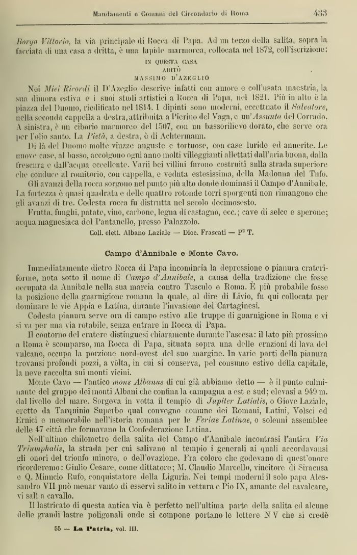Monte Cavo — l'antico mons Albanus di cui già abbiamo detto — è il punto culminante del gruppo dei monti Albani che conlina la campagna a est e sud ; elevasi a 940 m. dal livello (lei marci Sorgeva in vetta il tempio di Jupiter Latiulis, o Giovo Laziale, eretto da Tarqnìnio Superbo qua! convegno comune dei Romani, Latini, Voteci ed Krnici e memorabile nell'istoria romana per le Feriae Latinae, o solenni assemblee delle 47 città chi1 formavano la Confederazione Latina.