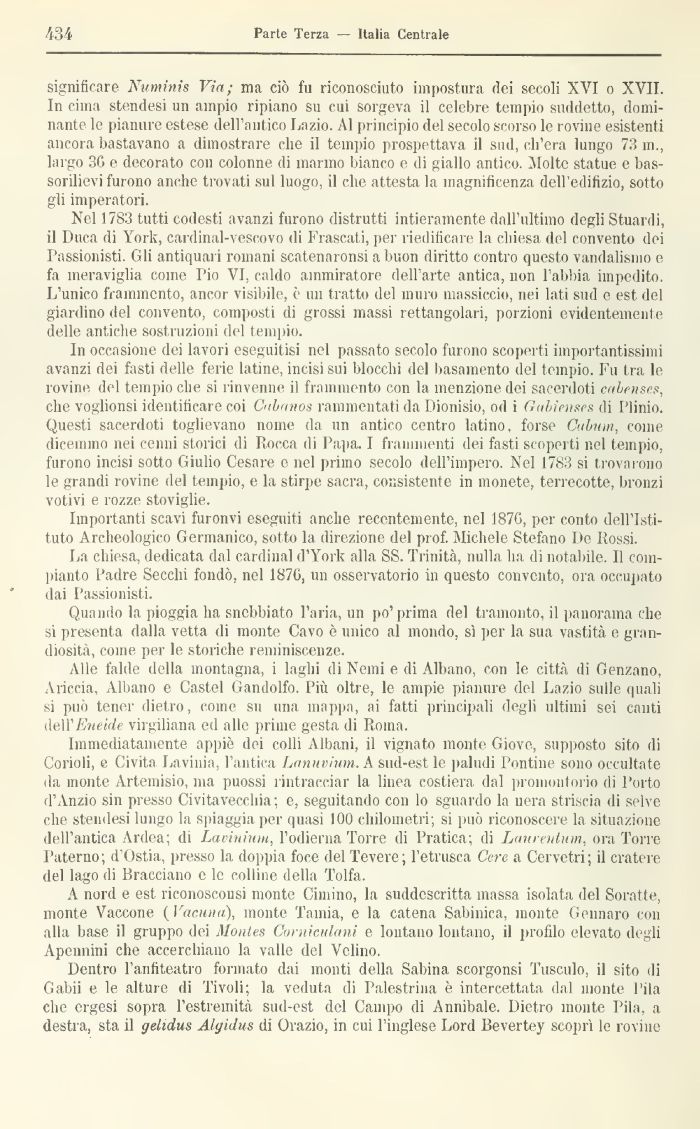 Immediatamente appiè dei colli Albani, il vignato monte Giove, supposto sito di Coi'ioli, e Civita Lavinia, l'antica Lanuvinm. A sud-est le paludi Pontine sono occultate da monte Artemisio, ma puossi rintracciar la linea costiera dal promontorio di Porto d'Anzio sin presso Civitavecchia; e, seguitando con lo sguardo la nera striscia di selve che stendesi lungo la spiaggia per quasi 100 chilometri; si può riconoscere la situazione dell'antica Ardea; di Lavininm, l'odierna Torre di Pratica; di Laureulum, ora Torre Paterno; d'Ostia, presso la doppia foce del Tevere ; l'etrusca Cere a Cervetri; il cratere del lago di Bracciano e le colline della Tolfa.