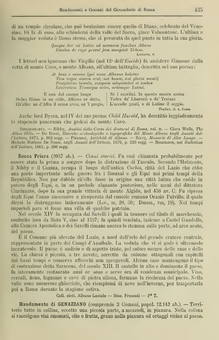 Rocca Priora (2057 ab.). — Cenni storici. Fu così chiamata probabilmente per essere stata la prima a sorgere dopo la distrazione di Tusculo. Secondo l'Holstenio,