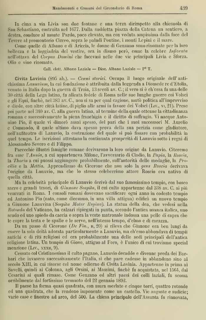 Civita Lavinia (895 ab.). — Cenni storici. Occupa il luogo originale dell' antichissima Laimvium, la cui fondazione è attribuita dalla leggenda a Diomede re d'Etolia, venuto in Italia dopo la guerra di Troia, 13 secoli av. C.; il vero si ò ch'essa fu una delle 30 città della Lega latina, fu alleata fedele di Roma nelle sue lunghe guerre coi Voteci e gli Equi, finché, nel3S3 av, C., non si saper qua! cagione, mutò politica all'improvviso e diede, con altre città latine, di piglio alle armi in favore dei Voteci (Liv., vi, 21). Prese poi parte nel 340 av. C. alla guerra latina, al termine della quale ottenne la cittadinanza romana e successivamente la piena franchigia e il diritto di suffragio. Vi nacque Antonino Pio, il quale vi dimorò assai spesso, del pari clic i suoi successori M. Aurelio e Couiiiiodo, il quale ultimo dava spesso prova della sua perizia come gladiatore, nell'anfiteatro di Lanuvio, la costruzione del quale si può fissare con probabilità ili quel tempo. Le iscrizioni attestano la continuata prosperità di Lanuvio sotto i regni di Alessandro Severo e di Filippo.