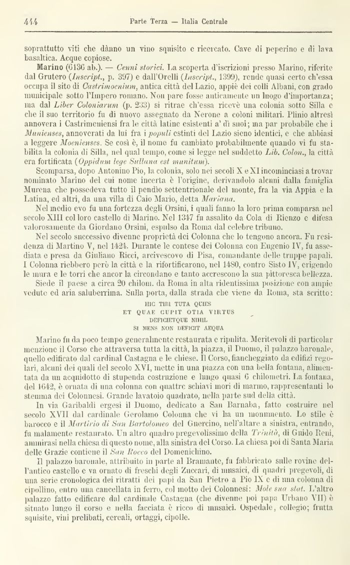 Marino (6136 ab.). — Cenni storici. La scoperta d'iscrizioni presso Marino, riferite dal Grutero (Inscript., p. 3(J7) e dall'Ovili (lnscript., 1399), rende quasi certo ch'essa occupa il sito di Castrimocnium, antica città (lei Lazio, appiè dei colli Albani, con grado municipale sotto l'Impero romano. Non pare fosse anticamente un luogo d'importanza; ma dal Libcr Coloniarum (p. 233) si ritrae ch'essa ricevè una colonia sotto Siila e che il suo territorio fu di nuovo assegnato da Nerone a coloni militari. Plinio altresì annovera i Castriuieniensi fra le città latine esistenti a' dì snoi; ma par probabile che i Munienses, annoverati da lui fra i populi estinti del Lazio sieno identici, e che abbiasi a leggere Moenienses. Se così è, il nome fu cambiato probabilmente quando vi fu stabilita la colonia di Siila, nel qua! tempo, come si legge nel suddetto Lib. Colon., la città era fortificata (Oppidum lege Sulhtnit est munitimi).