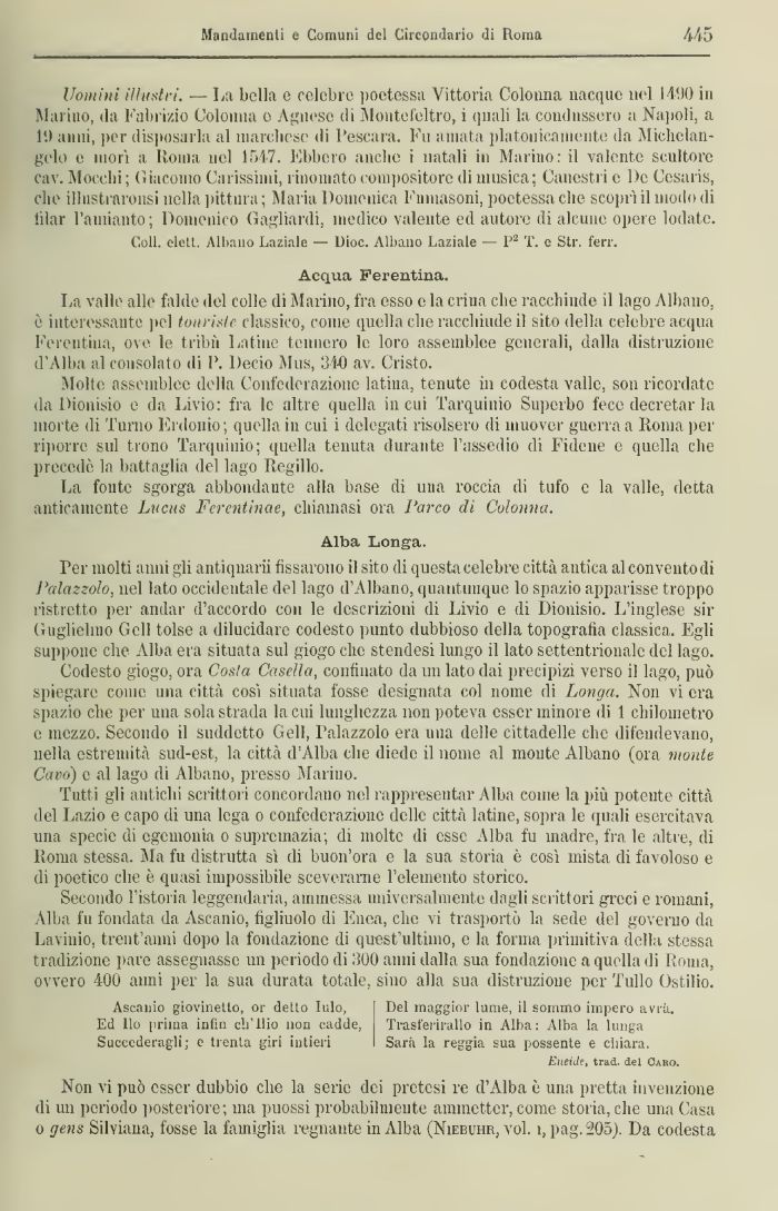 La valle alle falde del colle di Marino, fra esso e la crina che racchiude il lago Allumo, è interessante pel tonristc classico, come quella che racchiude il sito della celebre acqua Kereutiua, ove le tribù Latine tennero le loro assemblee generali, dalla distruzione d'Alba al consolato di I\ Decio Mas, 340 av. Cristo.